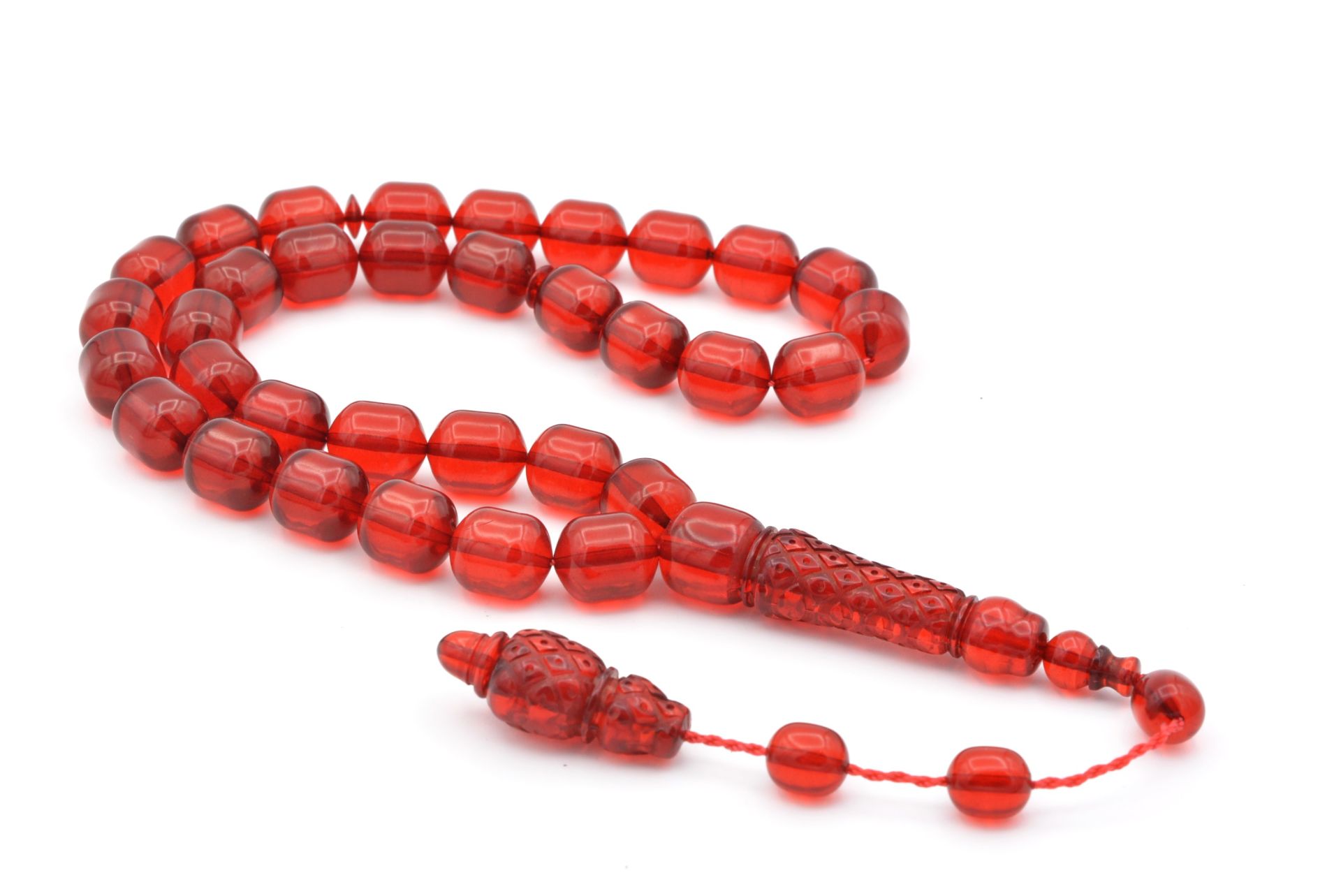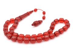 Sistemli Fıçı Kesim İri Boy Kırmızı Toz Pres Kehribar Tesbih